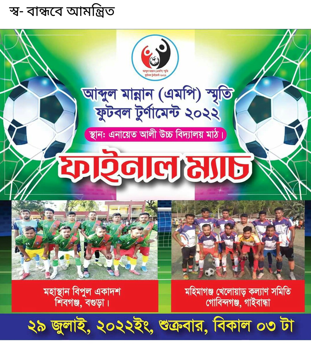 বগুড়ার সোনাতলায় আগামী ২৯ জুলাই'২০২২ রোজ শুক্রবার বেলা ১৫ঃ০০ ঘটিকায় এনায়েত আলী উচ্চ বিদ্যালয় মাঠে আব্দুল মান্নান (এমপি) স্মৃতি ফুটবল টুর্ণামেন্ট-২০২২ এর ফাইনাল ম্যাচ অনুষ্ঠিত হবে। ফাইনাল ম্যাচে অংশগ্রহণকারী দল হলোঃ মহাস্থান বিপুল একাদশ, শিবগঞ্জ, বগুড়া বনাম মহিমাগঞ্জ খেলোয়ার কল্যাণ সমিতি, গোবিন্দগঞ্জ, গাইবান্ধা।