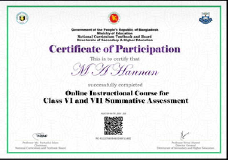 ষষ্ঠ ও সপ্তম শ্রেণির ষাণ্মাসিক সামষ্টিক মূল্যায়ন বিষয়ক অনলাইন ওরিয়েন্টেশন কোর্সটি সম্পূর্ণ করলাম । উক্ত কোর্সটি ২৬-৩০ মে ২০২৩ তারিখ পর্যন্ত উন্মুক্ত থাকবে। মাধ্যমিক পর্যায়ের শিক্ষা প্রতিষ্ঠানসমূহের (বিদ্যালয়, মাদ্রাসা ও কারিগরি) সকল শিক্ষককে অনলাইনে এনসিটিবি’র ই-লার্নিং প্লাটফর্মে যুক্ত হয়ে ‘ষষ্ঠ ও সপ্তম শ্রেণির ষাণ্মাসিক সামষ্টিক মূল্যায়ন বিষয়ক অনলাইন ওরিয়েন্টেশন' বিষয়ক কোর্সটি সম্পন্ন করার জন্য মাধ্যমিক ও উচ্চ শিক্ষা অধিদপ্তর থেকে নির্দেশনা প্রদান করা হয়েছে।